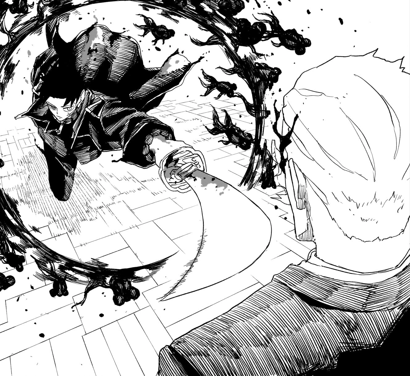 Chihiro launches Kuro forth at Kyora, the flying slash now also flaming. Recognising the strength of the attack as it sears the ground, Kyora blocks the attack with Magatsumi. Hiyuki then advances behind him with flaming fist raised, and Kyora quickly turns to block, before kicking Hiyuki back in order to block a strike from Chihiro. Chihiro realises Kyora's physical abilities had been greatly enhanced. As Hiyuki lands, Kyora then drags Magatsumi along the ground, a flower field appearing in its wake and preventing Chihiro and Hiyuki from approaching, and Kyora manages to draw a sliver of Magatsumi out of its sheath. An array of circular structures appears around Kyora before he uses Centipede and slams the blade into its sheath. An omnidirectional force is unleashed around Kyora, with both Chihiro and Hiyuki forced to block and blasted several metres away.