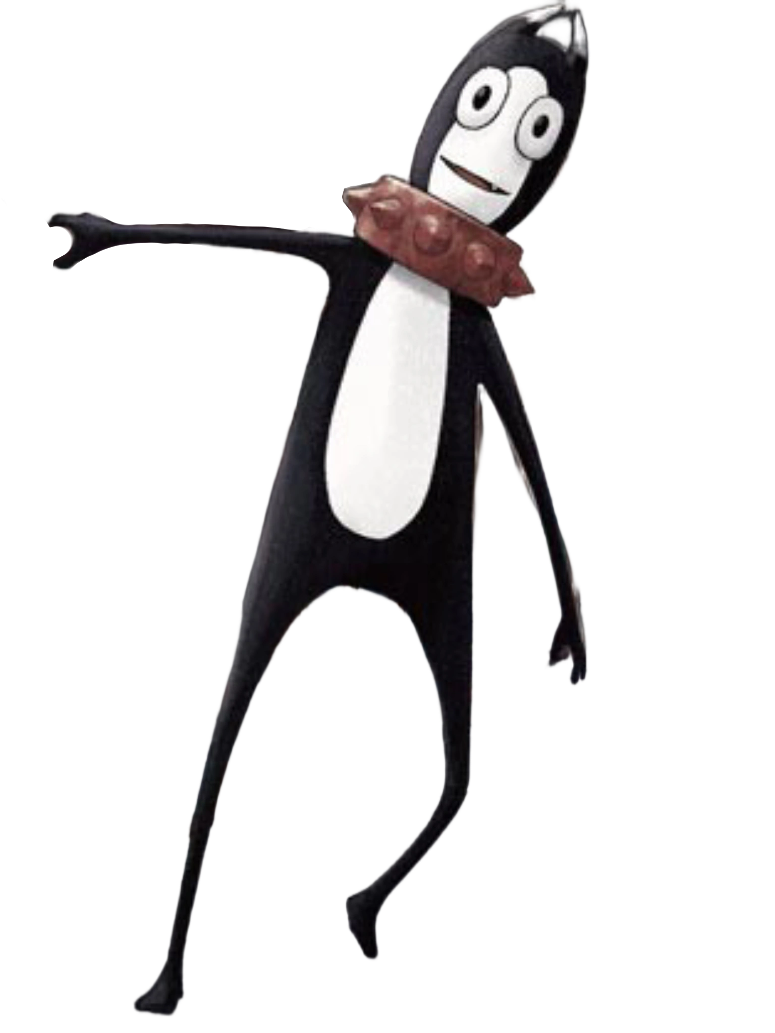 Lucille is slightly shorter in stature, yet it possesses an exceptionally slender physique with skin resembling a smooth, unblemished surface reminiscent of a featureless, jet-black material. Running from its eyes down to its stomach is a striking central band of white, akin to the appearance of a plush toy. Lucille also sports a substantial choker around its neck, likely serving as an accessory. Its ears are pointed, with both tips being fused. Large, expressive eyes adorn its face, while its mouth lacks discernible lips, and there is no visible nose.